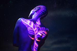 Onyi, an Ọ̀ṣun & Ọbàtálá priestess, body painted beneath a full Moon in Tulum, illuminated by moonlight &ultra violet light...