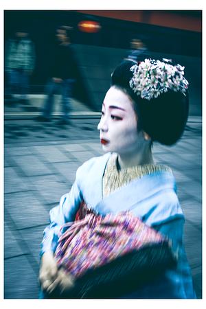 So fast and nimble on those wooden shoes... A Geisha in training, a Maiko leaves her tea house in The Gion, 'The Floating World' of Kyoto to go to an appointment, an instrument clutched in her silken bag... A Geisha, one who has mastered the ways wears a red collar that ditinguishes them from an apprentice Maiko.